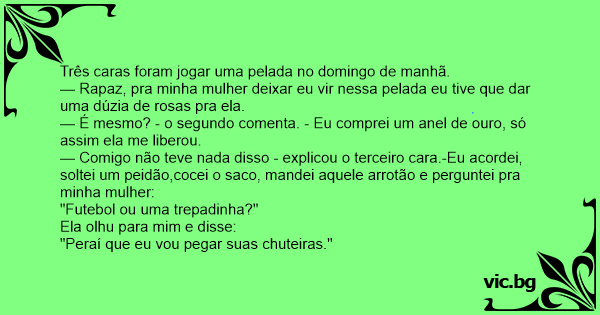 — Comigo não teve nada disso - explicou o terceiro cara.-Eu acordei, soltei um peidão,cocei o saco, mandei aquele arrotão e perguntei pra minha mulher:
