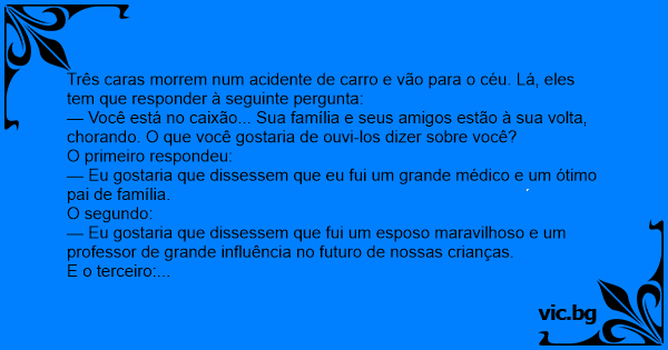 Três caras morrem num acidente de carro e vão para o céu. Lá, eles tem que responder à seguinte pergunta: