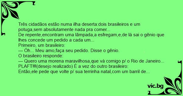 Três cidadãos estão numa ilha deserta:dois brasileiros e um potuga,sem absolutamente nada pra comer...