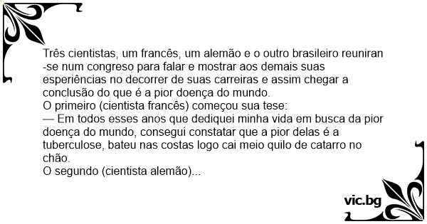 Três cientistas, um francês, um alemão e o outro brasileiro reuniran-se num congreso para falar e mostrar aos demais suas esperiências no decorrer de suas carreiras e assim chegar a conclusão do que é a pior doença do mundo.