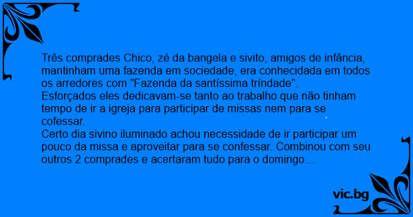 Três comprades Chico, zé da bangela e sivito, amigos de infância, mantinham uma fazenda em sociedade, era conhecidada em todos os arredores com "Fazenda da santíssima tríndade".