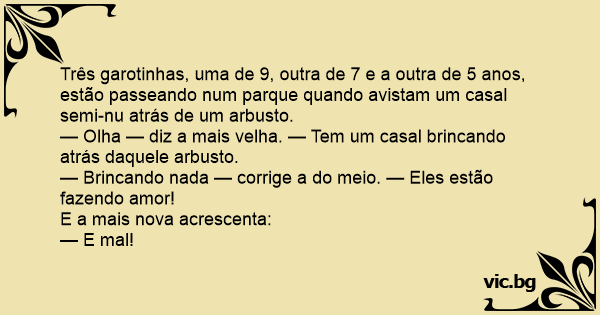 Três garotinhas, uma de 9, outra de 7 e a outra de 5 anos, estão passeando num parque quando avistam um casal semi-nu atrás de um arbusto.