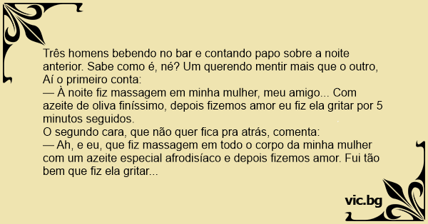 — À noite fiz massagem em minha mulher, meu amigo... Com azeite de oliva finíssimo, depois fizemos amor eu fiz ela gritar por 5 minutos seguidos.