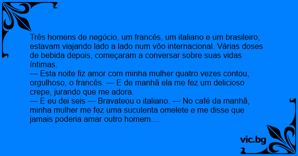 Três homens de negócio, um francês, um italiano e um brasileiro, estavam viajando lado a lado num vôo internacional. Várias doses de bebida depois, começaram a conversar sobre suas vidas íntimas.