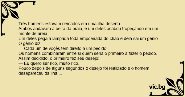 Os homens combinaram entre si quem seria o primeiro a fazer o pedido. Assim decidido, o primeiro fez seu desejo: