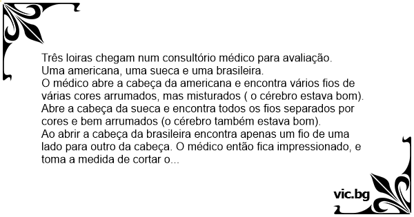 Ao abrir a cabeça da brasileira encontra apenas um fio de uma lado para outro da cabeça. O médico então fiса impressionado, e toma a medida de cortar o fio ao meio, e qual não e a surpresa que assim que corta as duas orelhas caem no chão (sinal que a loira não gtem nada de cérebro)