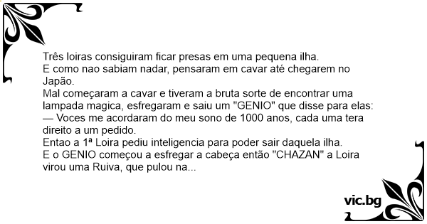 E o "GENIO" esfrefou e esfregou sua cabeça até dar calos nos dedos então "CHAZAN" a Loira virou uma Morena, que cortou um pé de palmeira e fez uma canoa para sair da ilha.