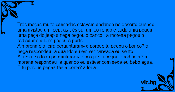 Três moças muito cansadas estavam andando no deserto quando uma avistou um jeep, as três sairam correndo,e cada uma pegou uma peça do jeep a nega pegou o banco , a morena pegou o radiador e a loira pegou a porta.