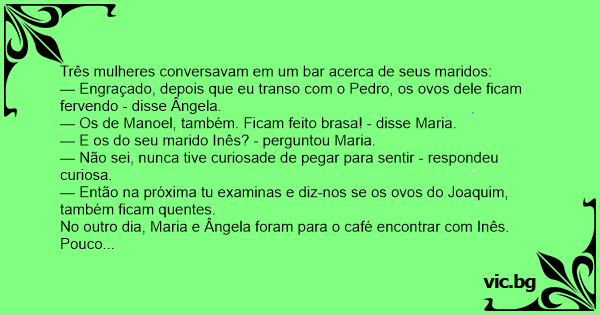 — Quando eu terminei de transar com o Joaquim, apalpei os ovos dele para ver se estavam quentes, aí ele perguntou: que é isso mulher? eu respondi: eu estou vendo se os teus ovos também ficam quentes depois da transa como os de Pedro e Manoel!