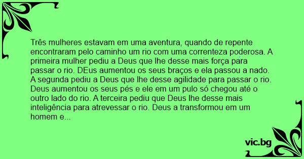 Três mulheres estavam em uma aventura, quando de repente encontraram pelo caminho um rio com uma correnteza poderosa. A primeira mulher pediu a Deus que lhe desse mais força para passar o rio. DEus aumentou os seus braços e ela passou a nado.