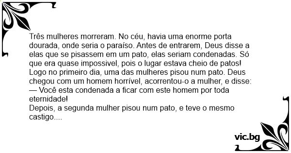 Três mulheres morreram. No céu, havia uma enorme porta dourada, onde seria o paraíso. Antes de entrarem, Deus disse a elas que se pisassem em um pato, elas seriam condenadas. Só que era quase impossivel, pois o lugar estava cheio de patos!