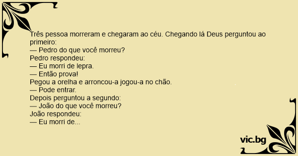 Três pessoa morreram e chegaram ao céu. Chegando lá Deus perguntou ao primeiro: