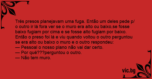 Três presos planejavam uma fuga. Então um deles pede p/ o outro ir lá fora ver se o muro era alto ou baixo,se fosse baixo fugiam por cima e se fosse alto fugiam por baixo.