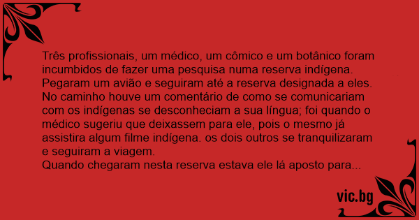 O médico então desceu e foi se apresentar: mim médicu!O índio arregalou os olhos meio assustado, em seguida vem o botânico que se apresenta da seguinte forma: mim botânicu! O índio ficara mais assustado ainda, de repente chega o último e se apresenta: mim comicu!