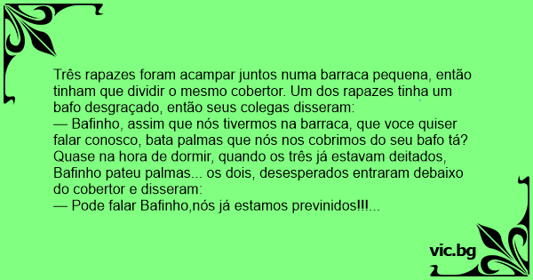 Três rapazes foram acampar juntos numa barraca pequena, então tinham que dividir o mesmo cobertor. Um dos rapazes tinha um bafo desgraçado, então seus colegas disseram: