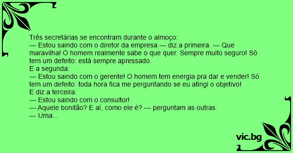 — Estou saindo com o diretor da empresa — diz a primeira. — Que maravilha! O homem realmente sabe o que quer. Sempre muito seguro! Só tem um defeito: está sempre apressado.