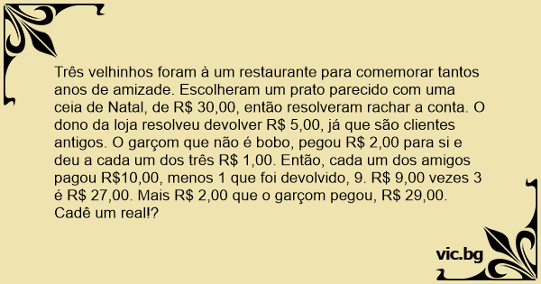 Três velhinhos foram à um restaurante para comemorar tantos anos de amizade. Escolheram um prato parecido com uma ceia de Natal, de R$ 30,00, então resolveram rachar a conta. O dono da loja resolveu devolver R$ 5,00, já que são clientes antigos. O garçom que não é bobo, pegou R$ 2,00 para si e deu a cada um dos três R$ 1,00. Então, cada um dos amigos pagou R$10,00, menos 1 que foi devolvido, 9. R$ 9,00 vezes 3 é R$ 27,00. Mais R$ 2,00 que o garçom pegou, R$ 29,00.