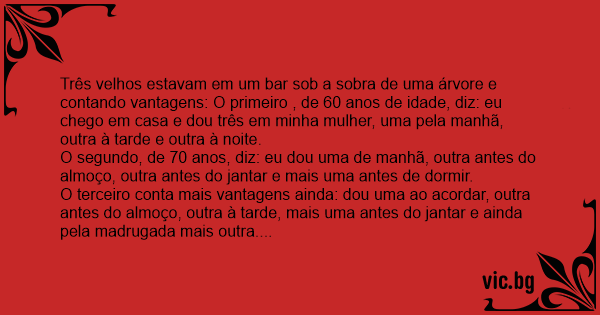 Três velhos estavam em um bar sob a sobra de uma árvore e contando vantagens: O primeiro , de 60 anos de idade, diz: eu chego em casa e dou três em minha mulher, uma pela manhã, outra à tarde e outra à noite.