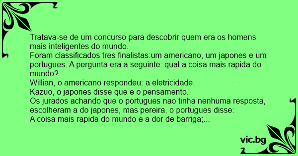 Foram classificados tres finalistas:um americano, um japones e um portugues. A pergunta era a seguinte: qual a coisa mais rapida do mundo?