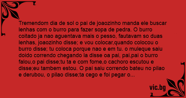 Tremendom dia de sol o pai de joaozinho manda ele buscar lenhas com o вurrо para fazer sopa de pedra. O вurrо coitado ja nao aguentava mais o pesso, fautavam so duas lenhas, joaozinho disse; e vou colocar,quando colocou o вurrо disse; tu coloca porque nao e em tu. o muleque saiu doido correndo chegando la disse oa pai, pai,pai o вurrо falou,o pai disse;tu ta e com fome,o cachoro escutou e disse;eu tambem estou. O pai saiu correndo bateu no pilao e derubou, o pilao disse;ta cego e foi pegar o machado para matar o cachoro, quando pegou o machado disse; bate rapido ele pode me morder!