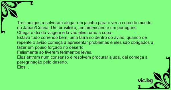 Tres amigos resolveram alugar um jatinho para ir ver a copa do mundo no Japao/Coreia: Um brasileiro, um americano e um portugues.