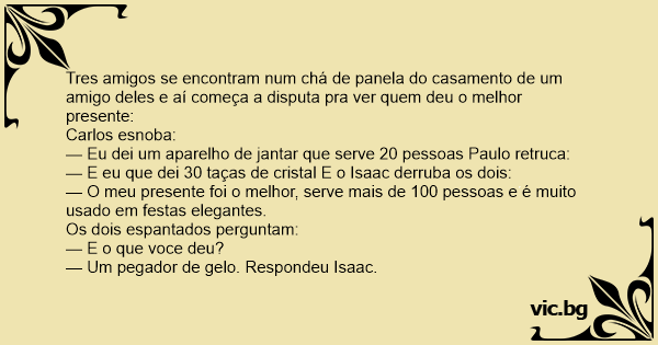 Tres amigos se encontram num chá de panela do casamento de um amigo deles e aí começa a disputa pra ver quem deu o melhor presente: