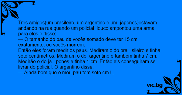 Então eles foram medir os paus. Mediram o do вrа- sileiro e tinha sete centímetros. Mediram o do argentino e também tinha 7 cm.. Medirão o do ja- pones e tinha 1 cm. Então els conseguiram se livrar do policial. O argentino disse: