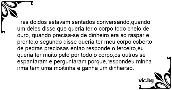 Tres doidos estavam sentados conversando,quando um deles disse que queria ter o corpo todo cheio de ouro, quando precisa-se de dinheiro era so raspar e pronto,o segundo disse queria ter meu corpo coberto de pedras preciosas entao responde o terceiro,eu queria ter muito pelo por todo o corpo,os outros se espantaram e perguntaram porque,respondeu minha irma tem uma moitinha e ganha um dinheirao.