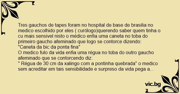 Tres gauchos de tapes foram no hospital de base de brasilia no medico escolhido por eles ( curólogo)querendo saber quem tinha o cu mais sensivel nisto o médico enfia uma caneta no toba do primeiro gaucho afeminado que logo se contorce dizendo: