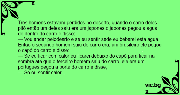 Tres homens estavam perdidos no deserto, quando o carro deles pifô então um deles saiu era um japones,o japones pegou a agua de dentro do carro e disse: