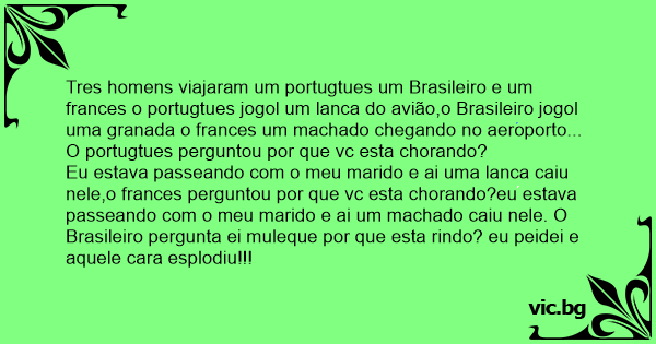 Tres homens viajaram um portugtues um Brasileiro e um frances o portugtues jogol um lanca do avião,o Brasileiro jogol uma granada o frances um machado chegando no aeroporto... O portugtues perguntou por que vc esta chorando?
