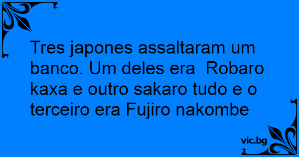 Tres japones assaltaram um banco. Um deles era Robaro kaxa e outro sakaro tudo e o terceiro era Fujiro nakombe