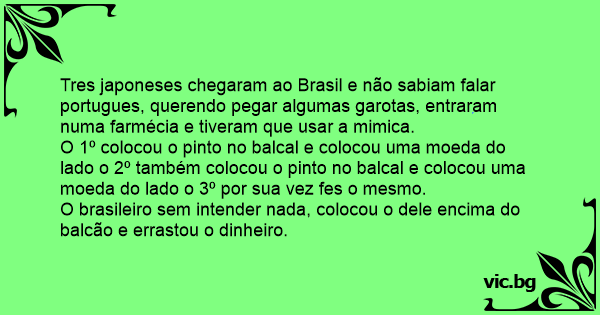 Tres japoneses chegaram ao Brasil e não sabiam falar portugues, querendo pegar algumas garotas, entraram numa farmécia e tiveram que usar a mimica.