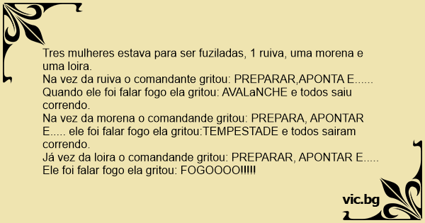 Tres mulheres estava para ser fuziladas, 1 ruiva, uma morena e uma loira.