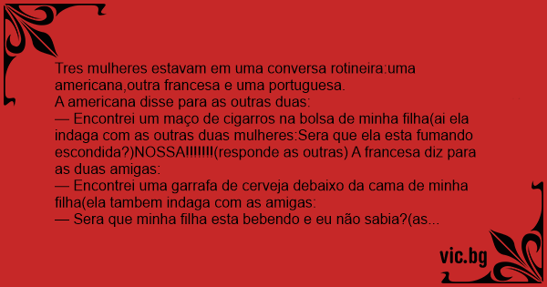 — Encontrei um maço de cigarros na bolsa de minha filha(ai ela indaga com as outras duas mulheres:Sera que ela esta fumando escondida?)NOSSA!!!!!!!(responde as outras) A francesa diz para as duas amigas: