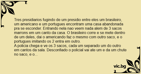 A policia chega e ve os 3 sacos, cada um separado um do outro em cantos da sala. Desconfiado o policial vai ate um e da um chute no saco, e o brasileiro esperto late imitando um сасhоrrо. "Oh, aqui tem um сасhоrrо, vamos ate o outro" diz o policial.