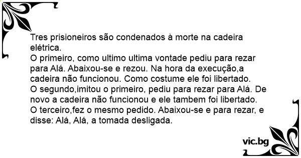 O terceiro,fez o mesmo pedido. Abaixou-se e para rezar, e disse: Alá, Alá, a tomada desligada.