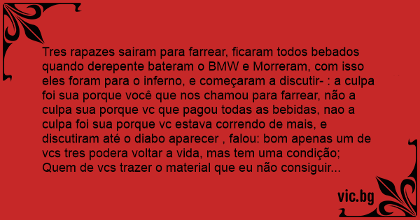 Tres rapazes sairam para farrear, ficaram todos bebados quando derepente bateram o BMW e Morreram, com isso eles foram para o inferno, e começaram a discutir- : a culpa foi sua porque você que nos chamou para farrear, não a culpa sua porque vc que pagou todas as bebidas, nao a culpa foi sua porque vc estava correndo de mais, e discutiram até o diabo aparecer , falou: bom apenas um de vcs tres podera voltar a vida, mas tem uma condição; Quem de vcs trazer o material que eu não consiguir derreter na Minha mão voltará a vida caso contrário vcs tres ficarão aqui pra sempre, no dia seguinte, um Achou um pedaço de concreto, o outro foi até um lugar onde possui minérios trouxe um diamante, e o ultimo pegou um M&Ms de uma garotinha que estava passando pela rua , horas mais tarde os tres voltaram para o inferno quando o primeiro deu o concreto para o diabo e ele derreteu a pedra que virou água , o próximo deu diamante e o mesmo derreteu façilmente, aí o último deu M&Ms e os outros dois começaram a dar risada do rapaz que trouxe o Chocolate , mas o diabo não consegui derreter o M&Ms e os dois ficaram de boca aberta, e perguntaram para o rapaz , Qual é o segredo desse M&Ms, simplismente ele respondeu , M&Ms o chocolate que derrete na sua boca e não na sua MÃO.