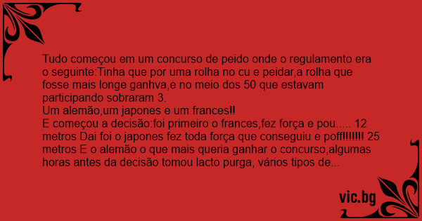 E começou a decisão:foi primeiro o frances,fez força e pou..... 12 metros Dai foi o japones fez toda força que conseguiu e poff!!!!!!! 25 metros E o alemão o que mais queria ganhar o concurso,algumas horas antes da decisão tomou lacto purga, vários tipos de purgante e tudo o que consegui tomar!!Tudo bem até chegar sua vez: