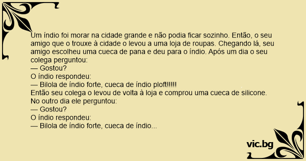 Um índio foi morar na cidade grande e não podia ficar sozinho. Então, o seu amigo que o trouxe à cidade o levou a uma loja de roupas. Chegando lá, seu amigo escolheu uma cueca de pana e deu para o índio. Após um dia o seu colega perguntou: