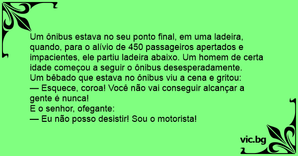 Um ônibus estava no seu ponto final, em uma ladeira, quando, para o alívio de 450 passageiros apertados e impacientes, ele partiu ladeira abaixo. Um homem de certa idade começou a seguir o ônibus desesperadamente.