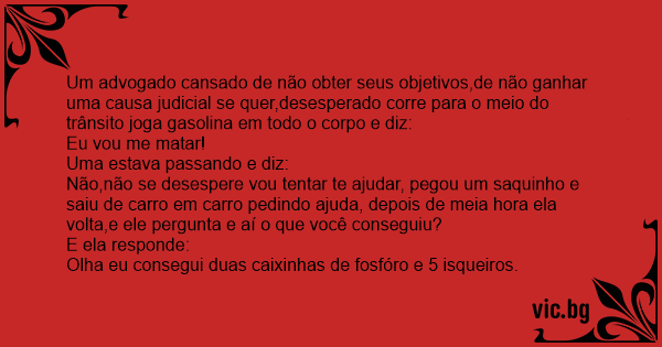 Um advogado cansado de não obter seus objetivos,de não ganhar uma causa judicial se quer,desesperado corre para o meio do trânsito joga gasolina em todo o corpo e diz: