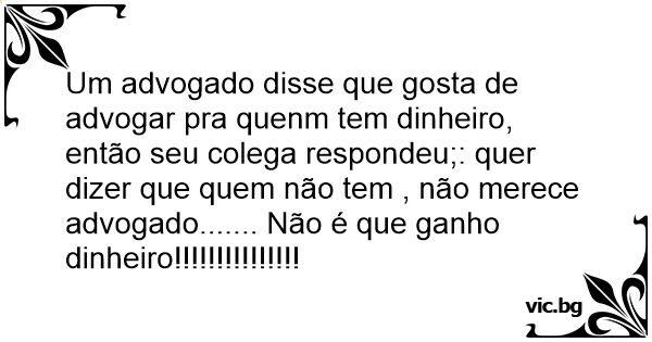 Um advogado disse que gosta de advogar pra quenm tem dinheiro, então seu colega respondeu;: quer dizer que quem não tem , não merece advogado....... Não é que ganho dinheiro!!!!!!!!!!!!!!!
