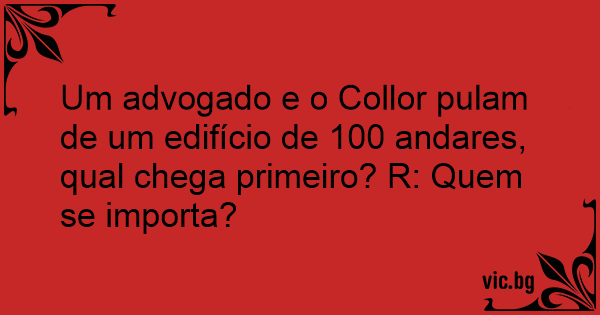 Um advogado e o Collor pulam de um edifício de 100 andares, qual chega primeiro? R: Quem se importa?