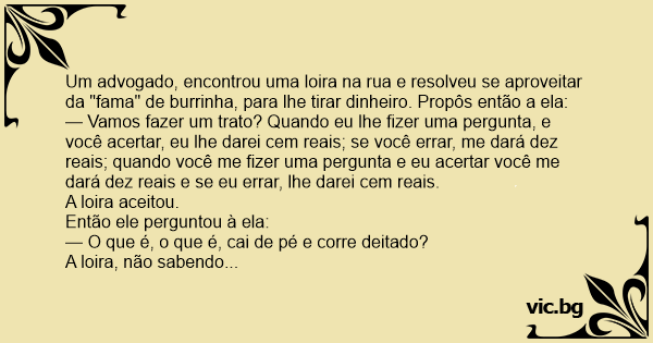 A loira, não sabendo responder, deu dez reais ao advogado e perguntou a ele: