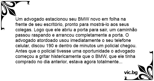— Como você pode dizer tal coisa? O senhor tem noção do valor de um BMW? — pergunta o advogado.