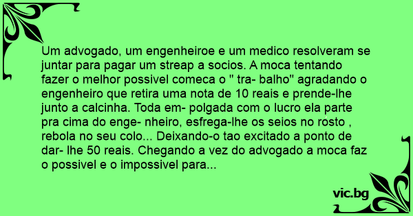 Um advogado, um engenheiroe e um medico resolveram se juntar para pagar um streap a socios. A moca tentando fazer o melhor possivel comeca o " tra- balho" agradando o engenheiro que retira uma nota de 10 reais e prende-lhe junto a calcinha. Toda em- polgada com o lucro ela parte pra cima do enge- nheiro, esfrega-lhe os seios no rosto , rebola no seu colo... Deixando-o tao excitado a ponto de dar- lhe 50 reais. Chegando a vez do advogado a moca faz o possivel e o impossivel para satisfazer-lhe, e ele e o que mais se aproveita da situacao,demo- rando mais que os outros; ao final do servico ele mete a mao no bolso e ao inves de retirar uma nota tira o cartao de credito, passa na " fenda" da mo- ca pega o dinheiro e vai embora...