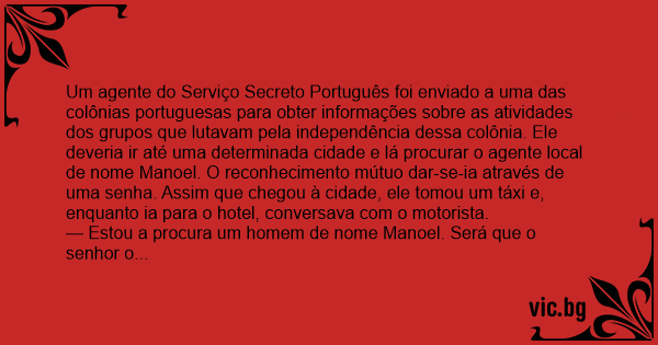 Um agente do Serviço Secreto Português foi enviado a uma das colônias portuguesas para obter informações sobre as atividades dos grupos que lutavam pela independência dessa colônia. Ele deveria ir até uma determinada cidade e lá procurar o agente local de nome Manoel. O reconhecimento mútuo dar-se-ia através de uma senha. Assim que chegou à cidade, ele tomou um táxi e, enquanto ia para o hotel, conversava com o motorista.
