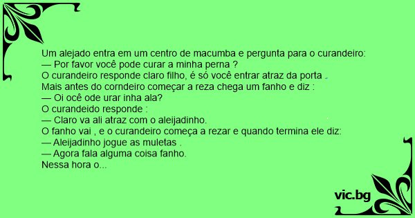 Um alejado entra em um centro de macumba e pergunta para o curandeiro: