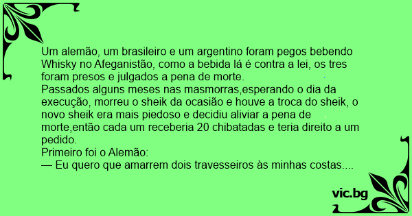 Um alemão, um brasileiro e um argentino foram pegos bebendo Whisky no Afeganistão, como a bebida lá é contra a lei, os tres foram presos e julgados a pena de morte.